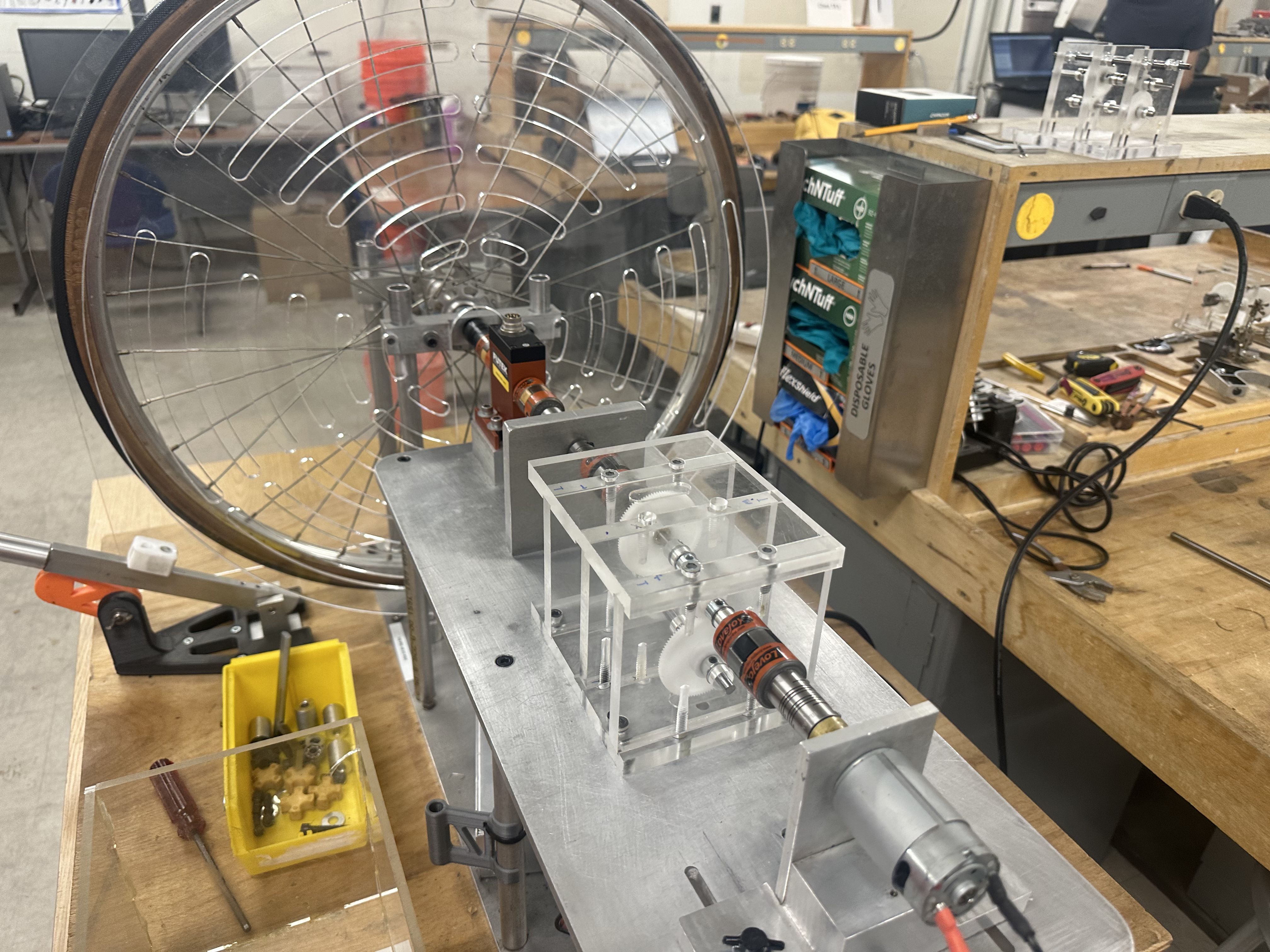 We selected a gear ratio that would optimize the maximum rotational speed of the wheel over the time it takes for the wheel to reach 250 rpm. We chose to add acrylic walls on top and bottom to dampen mechanical vibrations. During the fabrication stage of the project, we used the end-mill for dimensioning the acrylic walls of the enclosure, tapping screw holes for fastening the walls together, and drilling holes to press-fit ball bearings into. During our demonstration, we achieved a max rpm of 500 and it took 6.203 seconds for the system to reach 250 rpm.